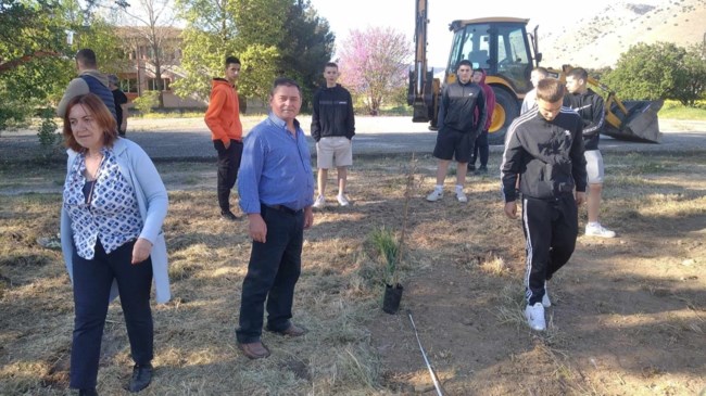 Χθες οι μαθητές της Α’ τάξης μαζί με καθηγητές, έκαναν την δενδροφύτευση. Μαθητές που ασχολούνται με τα χωράφια έφεραν τσάπες και αρίδα. Ο Δήμος, φτυάρια, βυτιοφόρο για πότισμα και ότι άλλο χρειαζόταν.