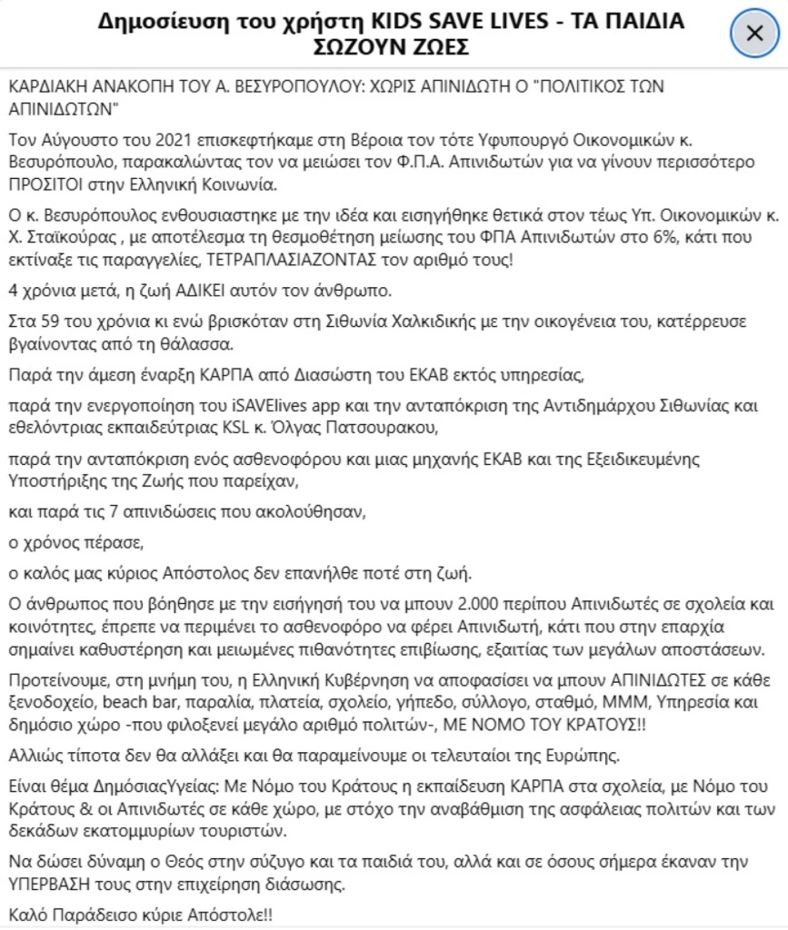 «Τον Αύγουστο του 2021 επισκεφτήκαμε στη Βέροια τον τότε Υφυπουργό Οικονομικών κ. Βεσυρόπουλο, παρακαλώντας τον να μειώσει τον Φ.Π.Α. Απινιδωτών για να γίνουν περισσότερο ΠΡΟΣΙΤΟΙ στην Ελληνική Κοινωνία.