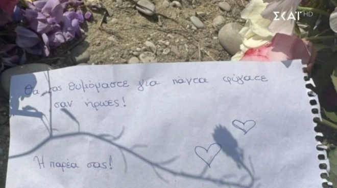 Το σημείωμα της παρέας των δύο παιδιών από την Άρτα το οποίο γράφει τα εξής: «Θα σας θυμόμαστε για πάντα, φύγατε σαν ήρωες! Η παρέα σας»