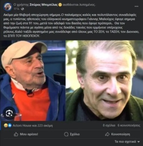 «Ακόμα μία θλιβερή αποχώρηση σήμερα. Ο παλαίμαχος καλός και πολυτάλαντος συναδελφός μας, ο τυπίστας ηθοποιός του ελληνικού κινηματογράφου, Γιάννης Μαλούχος, έφυγε σημερα από την ζωή στα 91 του. Μετά τον αδελφό του Βασίλη που έφυγε πρόπερσι. Θα τον θυμόμαστε πάντα με αγάπη μέσα από τις δεκάδες ταινίες που ερμήνευε υπέροχους ρόλους.. Καλό ταξίδι αγαπημένε μας συνάδελφε από όλους μας το ΣΕΗ, το ΤΑΣΕΗ, τον Διόνυσο, το Σπίτι του Ηθοποιού» έγραψε στη λεζάντα της ανάρτησης.