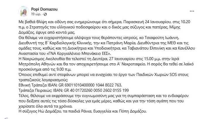 “Όποιος επιθυμεί αντί στεφάνων μπορεί να ενισχύσει το έργο των Παιδικών Χωριών SOS στους τραπεζικούς λογαριασμούς: Εθνική Τράπεζα IBAN: GR 69011010400000 1044 8022 763. Τράπεζα Πειραιώς: IBAN: GR 40 01720260 0050 2602 0155 199. Τέλος, θέλουμε να εκφράσουμε την ευγνωμοσύνη μας για τη συμπαράσταση και το ενδιαφέρον που δείξατε αυτές τις τόσο δύσκολες για εμάς μέρες, καθώς και για την τόση αγάπη που του χαρίσατε όλα αυτά τα χρόνια. Η σύζυγος Ηώ Δομάζου, τα παιδιά Ράνια, Ευαγγελία και Πόπη Δομάζου» αναφέρεται στην ανάρτηση της Πόπης Δομάζου.