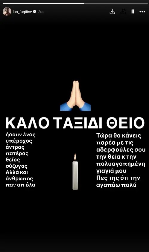 Ειδικότερα, ο Μπο έγραψε στον προσωπικό του λογαριασμό: «Καλό ταξίδι Θείο. Ήσουν ένας υπέροχος άντρας, πατέρας, θείος, σύζυγος, αλλά και άνθρωπος πάνω από όλα. Τώρα θα κάνεις παρέα με τις αδερφούλες σου, την θεία και πολυαγαπημένη μου γιαγιά. Πες της ότι την αγαπάω πολύ».