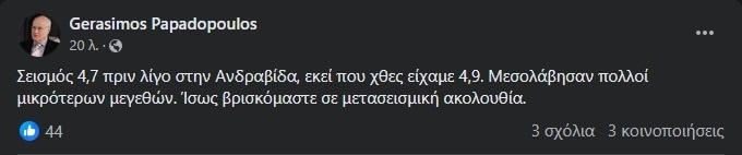 Σεισμός 4,7 πριν λίγο στην Ανδραβίδα, εκεί που χθες είχαμε 4,9. Μεσολάβησαν πολλοί μικρότερων μεγεθών. Ίσως βρισκόμαστε σε μετασεισμική ακολουθία.