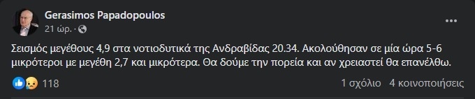 Σεισμός μεγέθους 4,9 στα νοτιοδυτικά της Ανδραβίδας 20.34. Ακολούθησαν σε μία ώρα 5-6 μικρότεροι με μεγέθη 2,7 και μικρότερα. Θα δούμε την πορεία και αν χρειαστεί θα επανέλθω.