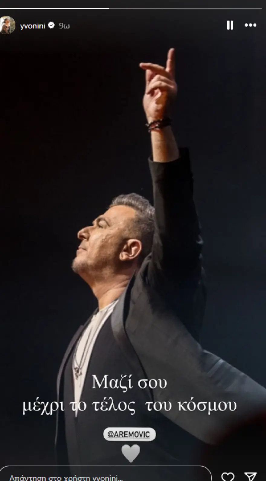 Με μια λιτή ανάρτηση στο Instagram, η σύζυγος του τραγουδιστή δημοσίευσε σε story μια φωτογραφία του από τη σκηνή, τη ώρα που τραγουδάει και έστειλε το δικό της μήνυμα. «Μαζί σου μέχρι το τέλος του κόσμου» τόνισε η Υβόννη Μπόσνιακ στον άντρα της, με έμμεση αναφορά σε ένα από τα τραγούδια του.