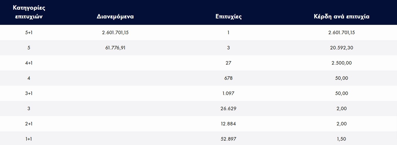 Στην πρώτη κατηγορία βρέθηκε ένας τυχερός, ο οποίος κερδίζει 600.000 ευρώ, ενώ στη δεύτερη κατηγορία βρέθηκαν 8 τυχεροί που κερδίζουν από 6.725,27 ευρώ.
