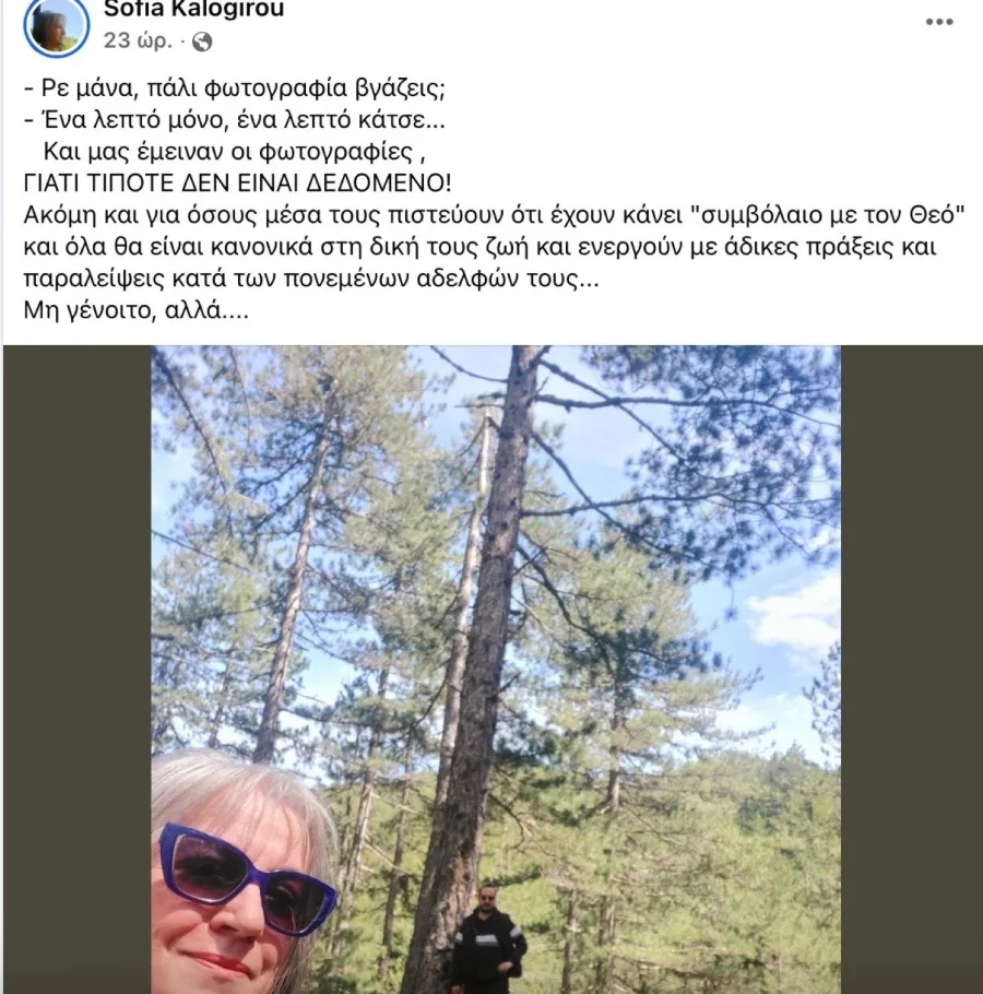 Η κ. Σοφία Αποστολάκη – Καλογήρου προχώρησε σε μια νέα ανάρτηση κόλαφο όπου κάνει λόγο για «ανθρώπους που πιστεύουν ότι έχουν κάνει “συμβόλαιο με τον Θεό” και όλα θα είναι κανονικά στη δική τους ζωή και ενεργούν με άδικες πράξεις και παραλείψεις κατά των πονεμένων αδελφών τους…»