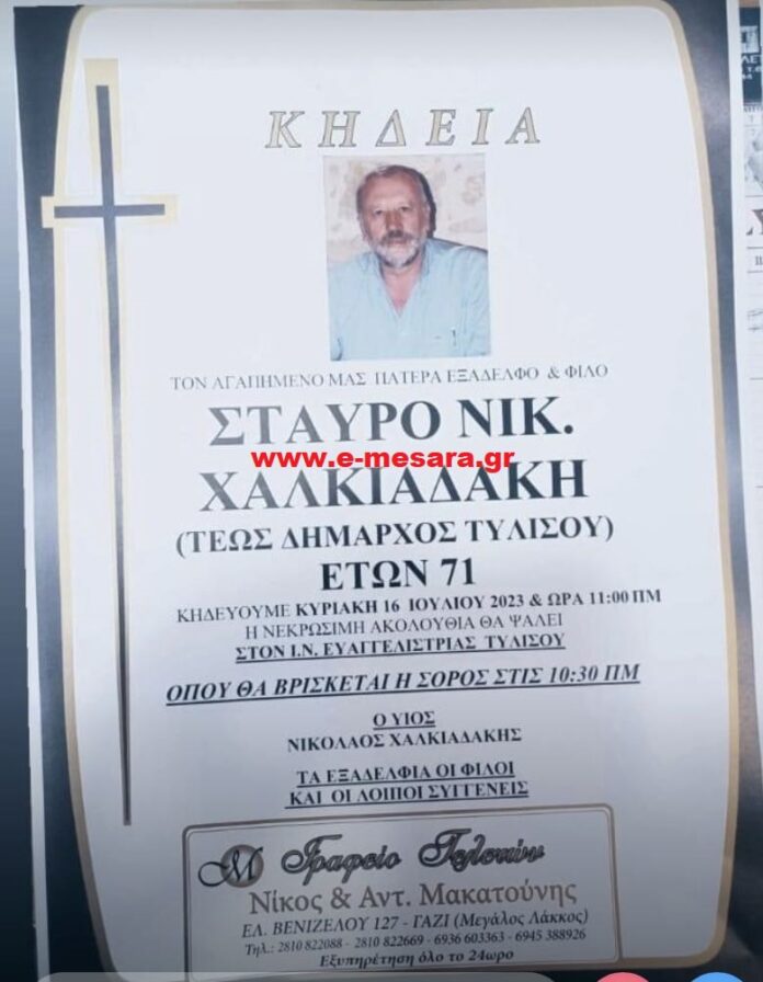 Αύριο Κυριακή, 16 Ιουλίου 2023 στις 11:00 το πρωι από τον Ιερό Ναό Ευαγγελίστριας Τυλίσου, η οικογένειά του, συγγενείς και φίλοι θα πουν το στερνό αντίο στον πρώην Δήμαρχο Σταύρο Χαλκιαδάκη, που έφυγε από τη ζωή σε ηλικία 71 χρόνων.