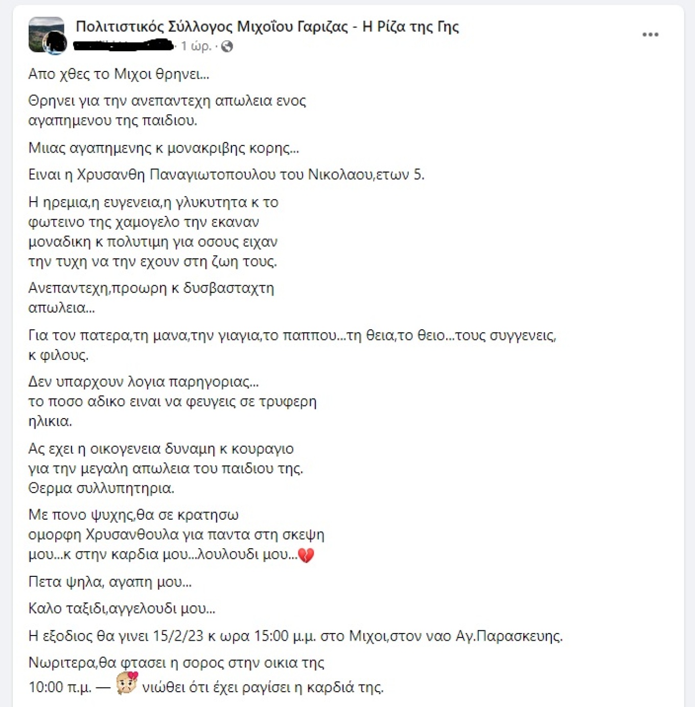 Η εξοδιος θα γινει 15/2/23 κ ωρα 15:00 μ.μ. στο Μιχοι,στον ναο Αγ.Παρασκευης.
