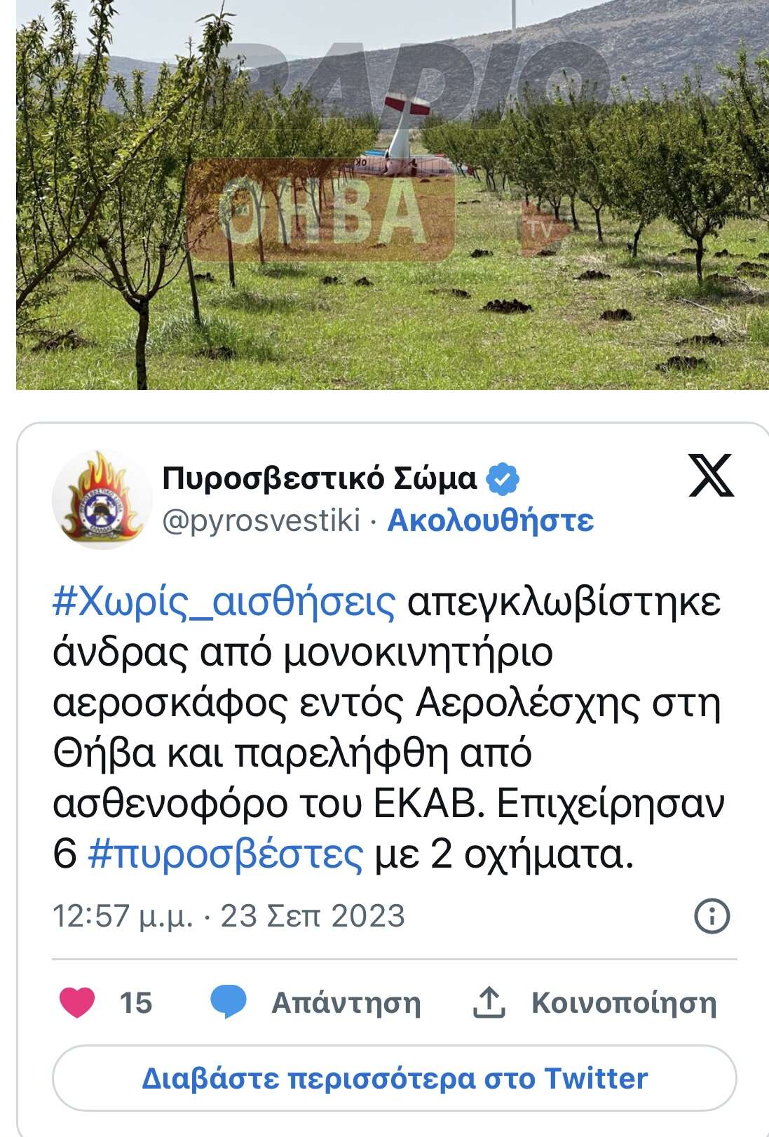 Τραγωδία στην αερολέσχη Θήβας το πρωί του Σαββάτου καθώς συνετρίβη μονοκινητήριο αεροπλάνο με αποτέλεσμα τον θάνατο του πιλότου. Στο σημείο επιχείρησαν 6 πυροσβέστες με 2 οχήματα, οι οποίοι απεγκλώβισαν τον άτυχο άνδρα χωρίς τις αισθήσεις τους.