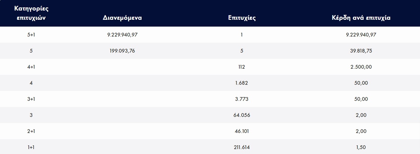 Στην πρώτη κατηγορία βρέθηκε ένας τυχερός, ο οποίος κερδίζει 854.136,74 ευρώ, ενώ στη δεύτερη κατηγορία σημειώθηκε τζακποτ. Στην τρίτη κατηγορία βρέθηκαν 11 τυχεροί που κερδίζουν από 2.500,00 ευρώ.