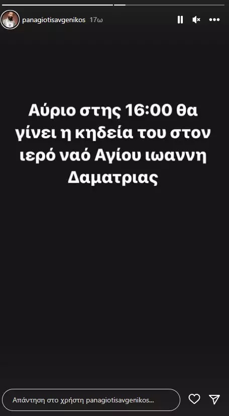 «Αύριο στις 16:00 θα γίνει η κηδεία του στον Ιερό ναό Αγίου Ιωάννη Δαμάτριας»