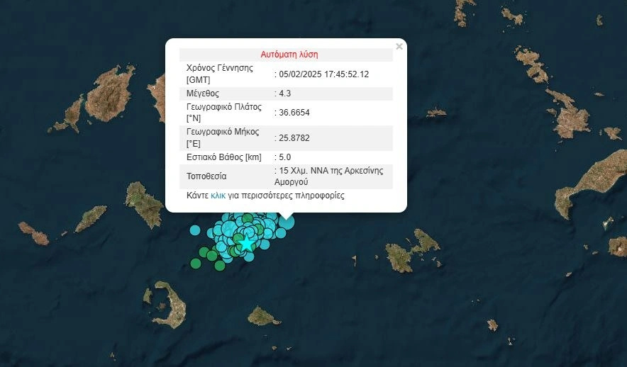 Πριν από λίγο διπλός σεισμός στην Αμοργό, με την πρώτη σεισμική δόνηση να υπολογίζεται στα 4,3 Ρίχτερ και την δεύτερη στα 4,6 Ρίχτερ.