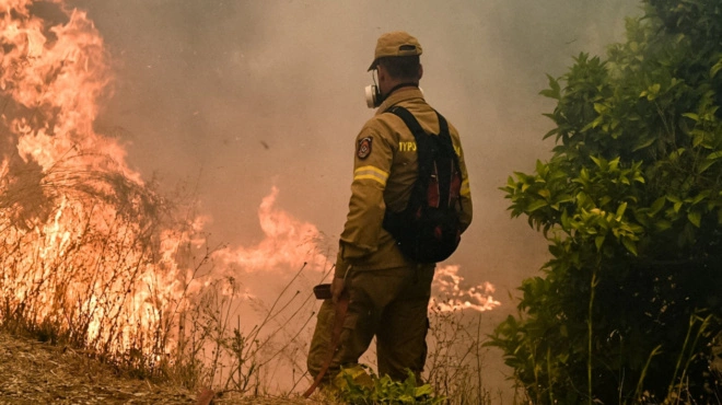 Η πυρκαγιά κατακαίει χαμηλή βλάστηση και δασική έκταση, ενώ απειλεί υποδομές ενεργειακής σημασίας.