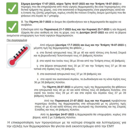 3. Από την Παρασκευή 21-7-2023 έως και την Κυριακή προβλέπεται περαιτέρω άνοδος της θερμοκρασίας στα ηπειρωτικά με τις μέγιστες τιμές να φθάνουν τους 41 με 43 και κατά τόπους στο εσωτερικό της Θεσσαλίας και της Στερεάς Ελλάδας τους 44 βαθμούς Κελσίου.