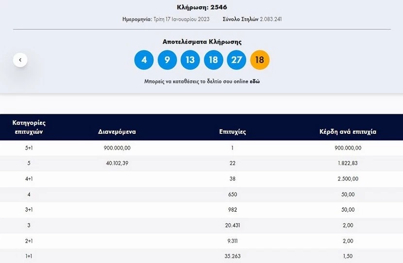 Στην πρώτη κατηγορία βρέθηκε ένας τυχερός ο οποίος κερδίζει 900.000 ευρώ, ενώ στη δεύτερη κατηγορία βρέθηκαν 22 τυχεροί που κερδίζουν από 1.822,83 ευρώ.