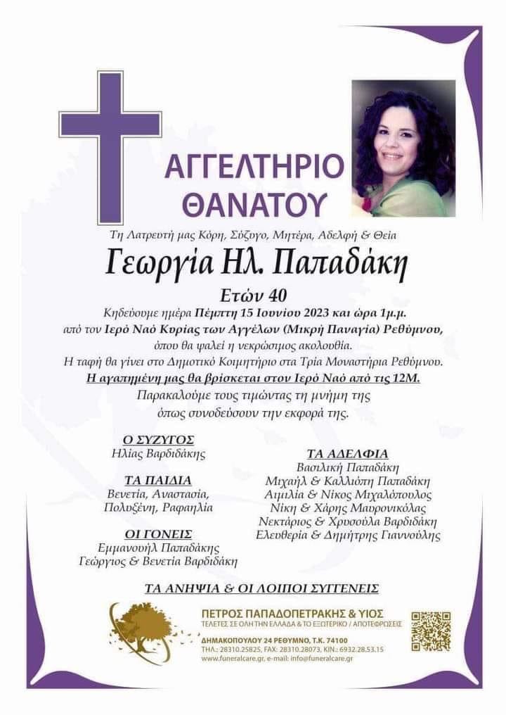 Η Γεωργία Παπαδάκη από το Ρέθυμνο, έχασε τη μάχη με τον καρκίνο, σε ηλικία 40 ετών, βυθίζοντας στο πένθος την οικογένεια της, αλλά και την τοπική κοινωνία.
