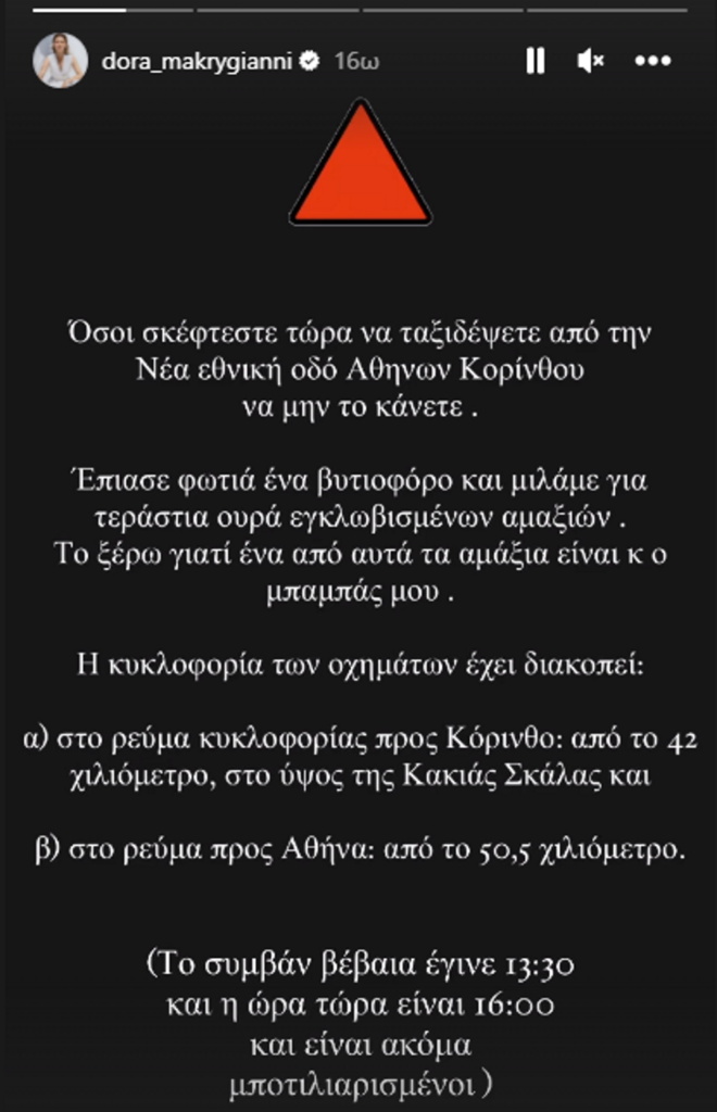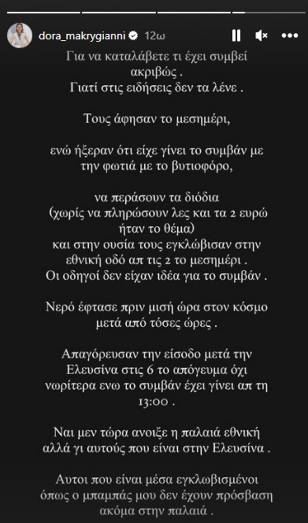 Μηνύματα αγανάκτησης για την ταλαιπωρία των οδηγών μοιράστηκε και η ηθοποιός Ντόρα Μακρυγιάννη, με τον πατέρα της να βρίσκεται ανάμεσα σε όσους εγκλωβίστηκαν.