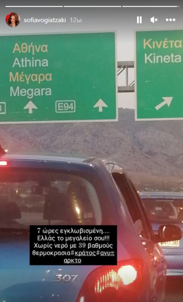 Προηγουμένως σε βίντεο που αναρτούσε από το αυτοκίνητό της περιέγραφε την κατάσταση που βίωσαν. «Εγκλωβισμένη στην Εθνική. Κλειστή η παλιά Εθνική. Της Ολυμπίας δεν κουνάει ούτε μπρος ούτε πίσω. Έχουμε κάνει 7 ώρες που είμαστε εδώ ακινητοποιημένοι μισό χιλιόμετρο. Με 40 βαθμούς θερμοκρασία έξω. Πήρε φωτιά ένα βυτιοφόρο με υγραέριο και περιμένουμε. Και ένας Θεός ξέρει τι θα γίνει. Αφού υπήρχε αυτό το θέμα γιατί άνοιξαν τα διόδια και επέτρεψαν σε τόσο κόσμο να περάσει για να εγκλωβιστεί; Ας μου το εξηγήσει κάποιος αυτό παρακαλώ πολύ», έλεγε η Σοφία Βογιατζάκη.