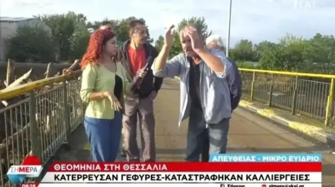 Στην εκπομπή «Σήμερα» του ΣΚΑΪ, κατά τη διάρκεια ζωντανής σύνδεσης με το Μικρό Ευίδριο Λάρισας, χωριό που βρίσκεται δίπλα στον ποταμό Ενιπέα και έχει υποστεί ολική καταστροφή από τις πλημμύρες, η αγανάκτηση των κατοίκων ήταν μεγάλη.