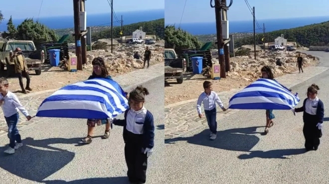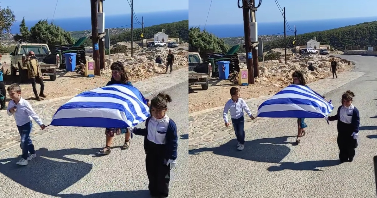 Οι δυο μαθητές του δημοτικού σχολείου του νησιού -ένα αγόρι κι ένα κορίτσι- κρατώντας τη γαλανόλευκη στα χέρια σκόρπισαν ρίγη συγκίνησης και χαράς.