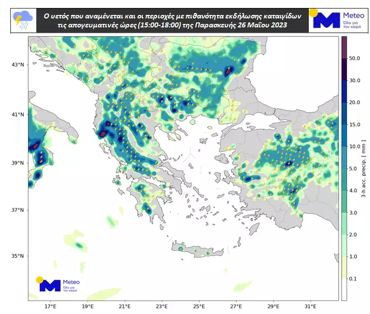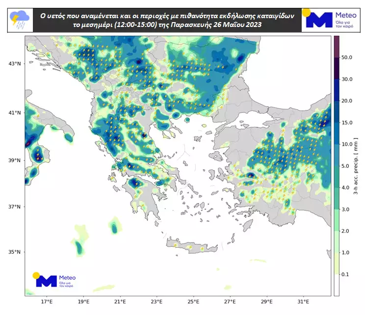 Στους χάρτες που ακολουθούν παρουσιάζεται ενδεικτικά ο υετός που αναμένεται κατά το μεσημέρι (12:00 – 15:00) και κατά τις πρώτες απογευματινές ώρες (15:00 – 18:00) της Παρασκευής 26/05 ενώ με τα σύμβολα των κεραυνών σημειώνονται και οι περιοχές όπου υπάρχει πιθανότητα εκδήλωσης καταιγίδων.