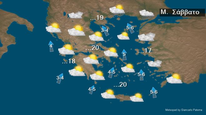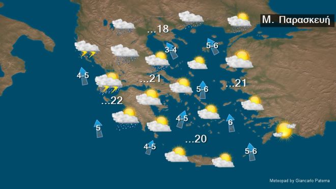 Νεφώσεις κατά τόπους πιο πυκνές με λίγες τοπικές βροχές στα δυτικά και βόρεια ενώ μεμονωμένες καταιγίδες είναι πιθανό να σημειωθούν στο Αιγαίο και από το βράδυ στα Δωδεκάνησα. Οι άνεμοι θα πνέουν από δυτικές διευθύνσεις και στο Αιγαίο από νότιες, 3 με 5 και στο ανατολικό Αιγαίο 6 με 7 μποφόρ με βαθμιαία εξασθένηση από το απόγευμα. Η θερμοκρασία θα σημειώσει μικρή πτώση.