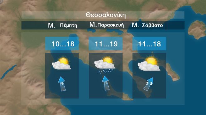 Στη Θεσσαλονίκη προβλέπονται τοπικές νεφώσεις με βροχές την Μ. Παρασκευή . Η θερμοκρασία θα έχει μέγιστες τιμές περί τους 18 με 19 βαθμούς Κελσίου .