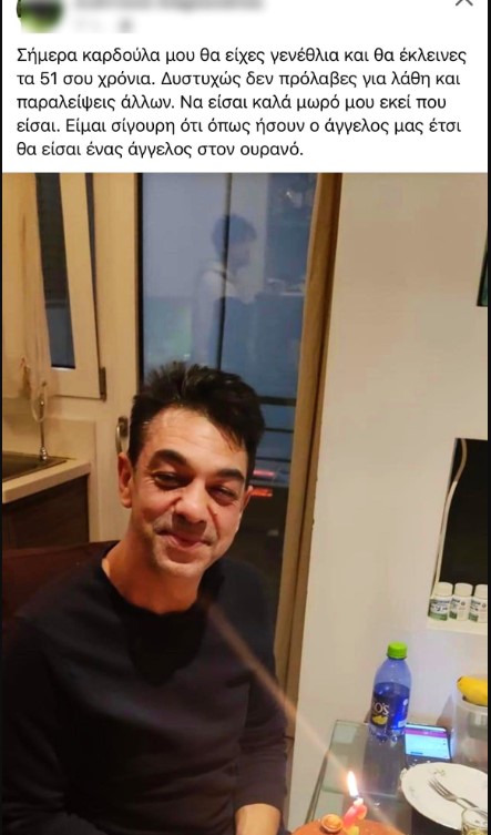 «Σήμερα καρδούλα μου θα είχες γενέθλια και θα έκλεινες τα 51 σου χρόνια. Δυστυχώς δεν πρόλαβες για λάθη και παραλείψεις άλλων. Να είσαι καλά μωρό μου εκεί που είσαι. Είμαι σίγουρη ότι όπως ήσουν ο άγγελος μας θα είσαι ένα άγγελος στον ουρανό».