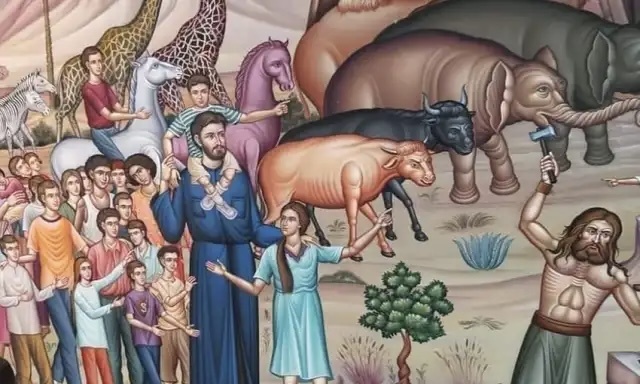 Στο εκκλησάκι του έκτου ορόφου, στη δομή του Κολωνού, τον κεντρικό τοίχο κοσμεί μια αγιογραφία, η οποία αναπαριστά τον πατέρα Αντώνιο σε ρόλο Νώε να καθοδηγεί τα «παιδιά» του μαζί με τα ζώα στην Κιβωτό.