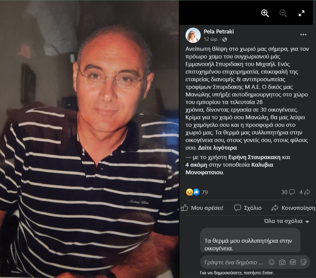 Κρίμα για τον χαμό σου Μανώλη, θα μας λείψει το χαμόγελό σου και η προσφορά σου στο χωριό μας.