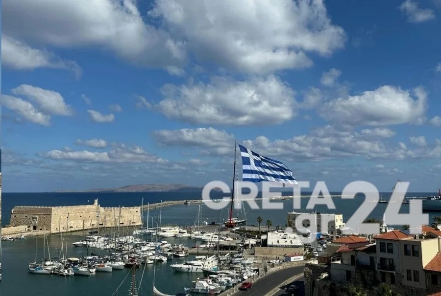 Όπως σε κάθε εθνική επέτειο έτσι και σήμερα υψώθηκε η τεράστια ελληνική σημαία στο Ηράκλειο Κρήτης.