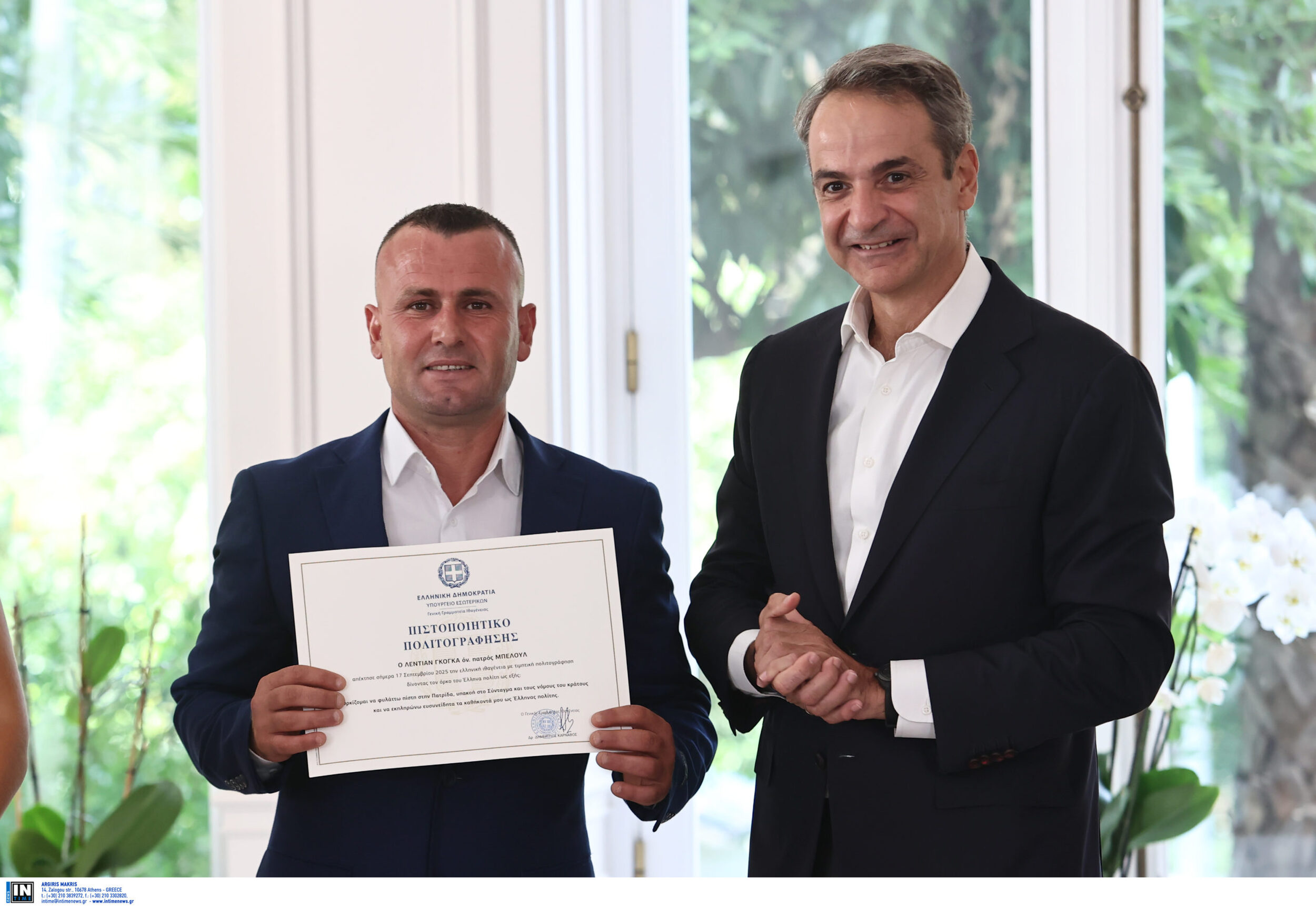 Ο Γκόγκα Λεντιάν έδωσε τον όρκο του Έλληνα πολίτη ενώπιον του Κυριάκου Μητσοτάκη, παρουσία του υπουργού Εσωτερικών, Θοδωρή Λιβάνιου και του Γενικού Γραμματέα Ιθαγένειας, Δημήτρη Κάρναβου.