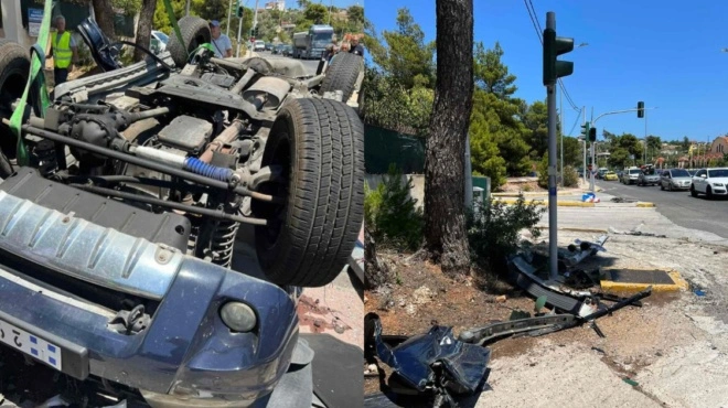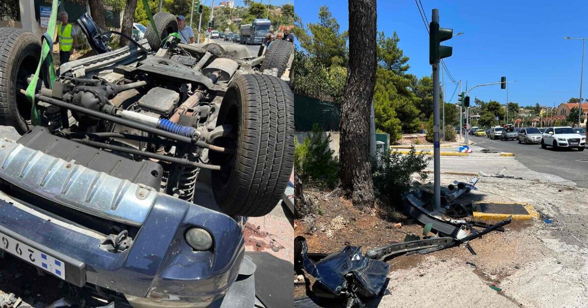 Η σύγκρουση ήταν σφοδρή και το ένα από τα αυτοκίνητα αναποδογύρισε στο απέναντι πεζοδρόμιο.
