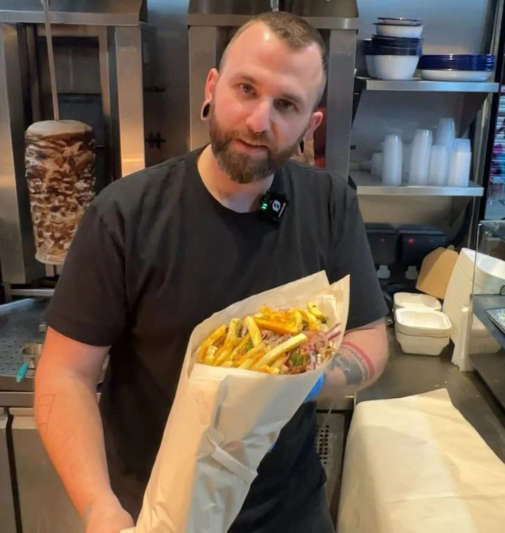 «Έφυγα από την Ελλάδα το 2018, ενώ βρισκόταν σε βαθιά οικονομική κρίση. Πριν από 3,5 χρόνια, αποφάσισα να ανοίξω τον “Pittagoras”, το όνομα είναι ένα έξυπνο λογοπαίγνιο που προσελκύει το ενδιαφέρον. Δεν είναι όμως το μόνο που προσελκύει τους πελάτες μας. Πρόσφατα, προσθέσαμε στο μενού μας έναν “γίγας γύρο” 4 κιλών ως πρόκληση. Όποιος μπορέσει να τον φάει μέσα σε 15 λεπτά, τον απολαμβάνει δωρεάν.