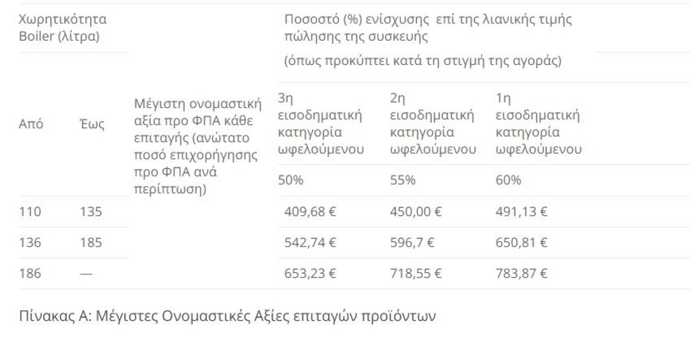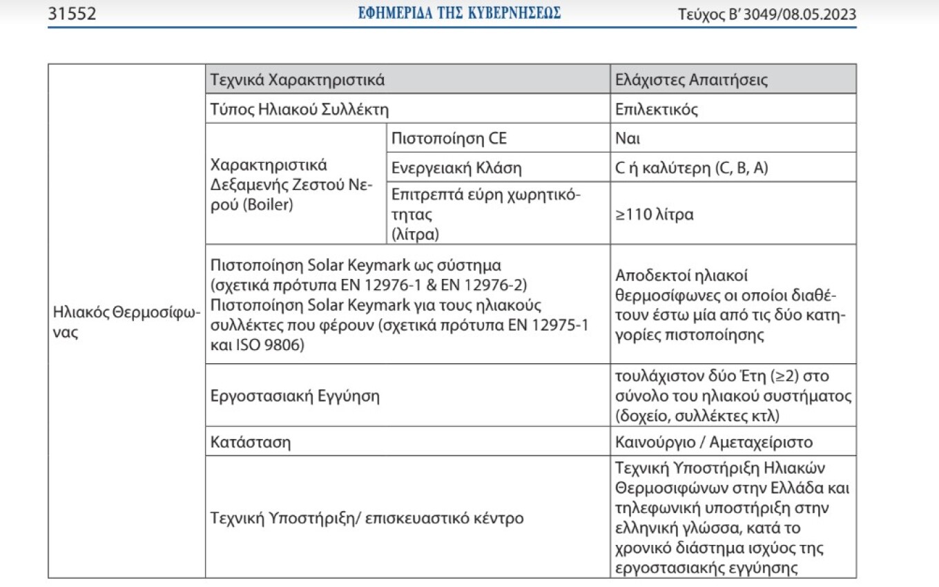 – Νέου Ηλιακού Θερμοσίφωνα προς αντικατάσταση του Παλαιού Ηλεκτρικού Θερμοσίφωνα, μόνο εφόσον ο παλαιός προς απόσυρση θερμοσίφωνας έχει χωρητικότητα ίση ή μεγαλύτερη των σαράντα (40) λίτρων. Οι προς ανακύκλωση θερμοσίφωνες θα πρέπει να είναι άρτιοι, όπως μπορεί να επιβεβαιωθεί μετά από γενικό οπτικό έλεγχο, πριν την απόσυρσή τους. Επίσης πρέπει πριν την αντικατάστασή τους θα πρέπει να ήταν τοποθετημένοι στην κατοικία η οποία δηλώνεται στην αίτηση