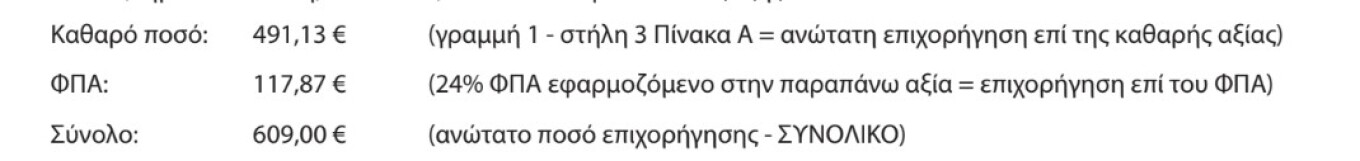 – Παράδειγμα #1: ωφελούμενος της πρώτης εισοδηματικής κατηγορίας από την Περιφέρεια Πελοποννήσου προμηθεύεται ηλιακό θερμοσίφωνα 120 λίτρων από τοπικό προμηθευτή. Μπορεί να επιχορηγηθεί μέχρι του ανώτατου ποσού (δημόσια δαπάνη) των € 609,00 το οποίο προκύπτει ως εξής: