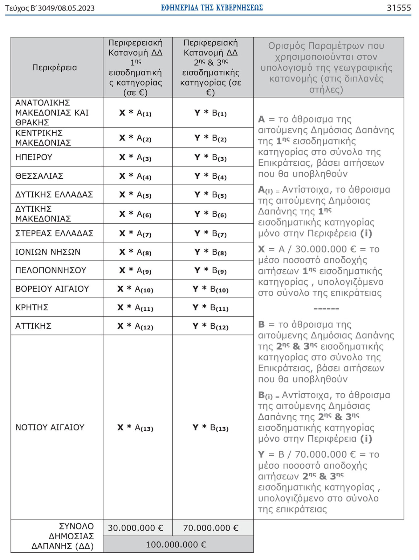 Η κατανομή της δημόσιας δαπάνης που προορίζεται αφενός για την 1η εισοδηματική κατηγορία (30.000.000 €) και αφετέρου, για την 2η και 3η (μαζί) εισοδηματικές κατηγορίες (70.000.000 €), θα γίνει ανά γεωγραφική Περιφέρεια (2 χωριστές γεωγραφικές κατανομές).