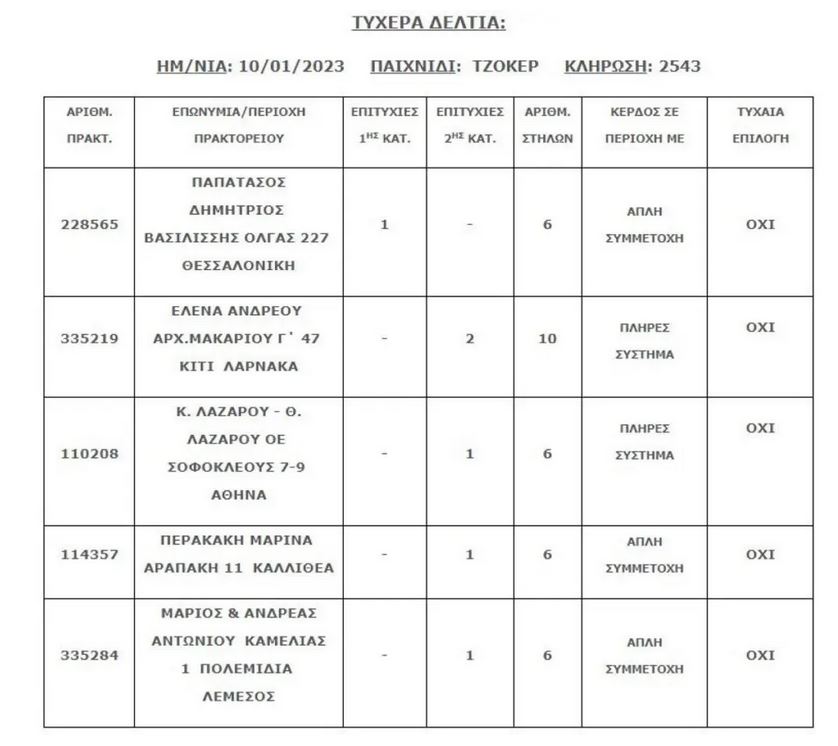 Παράλληλα στην δεύτερη κατηγορία (5άρια) βρέθηκαν πέντε επιτυχίες σε Λάρνακα (2), κέντρο Αθήνας, Καλλιθέα και Λεμεσό οι οποίες κερδίζουν το ποσό των 20.817,06 ευρώ έκαστη.
