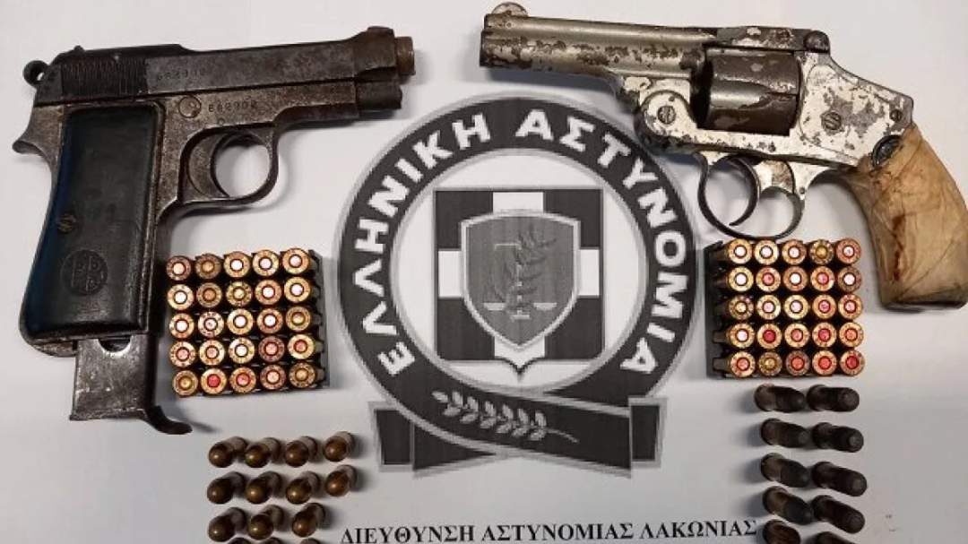Κατά την έρευνα που έγινε στην κατοικία της 52χρονης Ελληνίδας, το πρωί της Παρασκευής, βρέθηκαν ένα πιστόλι, ένα περίστροφο και 76 φυσίγγια διαφόρων διαμετρημάτων τα οποία κατασχέθηκαν. Τα όπλα εστάλησαν στα εγκληματολογικά εργαστήρια για βαλλιστική εξέταση και η 52χρονη οδηγήθηκε στον εισαγγελέα Πρωτοδικών Γυθείου, που της απήγγειλε κατηγορία για παράνομη οπλοκατοχή.