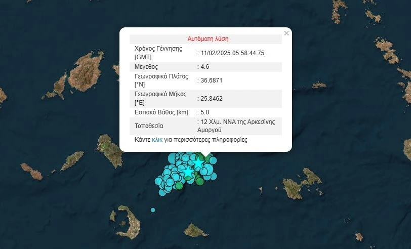 Μετά 5,3 Ρίχτερ που σημειώθηκαν το βράδυ της Δευτέρας, σύμφωνα με την αναθεωρημένη λύση του Γεωδυναμικού Ινστιτούτου του Αστεροσκοπείου Αθηνών, σημειώθηκε στις 00:37 μετά τα μεσάνυχτα νέος σεισμός, μεγέθους 5 βαθμών της κλίμακας Ρίχτερ. Ο νέος σεισμός είχε εστιακό βάθος στα 13,3 χλμ., και επίκεντρο τα 17 χλμ. νότια – νοτιοδυτικά της Αρκεσίνης Αμοργού.