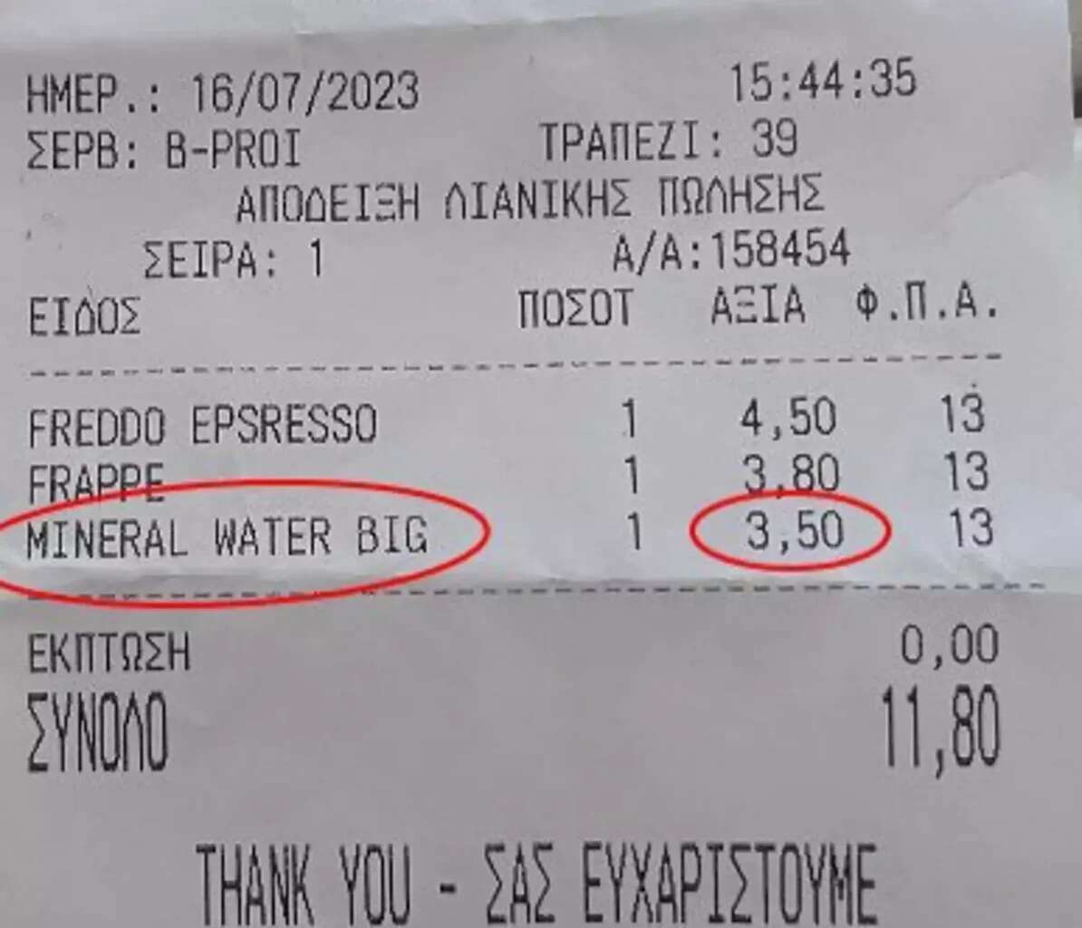 Ακριβά πλήρωσαν ένα μπουκάλι νερό πολίτες που ελέω καύσωνα ήθελαν να ξεδιψάσουν. Ενώ έκαναν το μπάνιο τους στη θάλασσα, αφού πλήρωσαν 10 ευρώ την ξαπλώστρα, ζήτησαν από παρακείμενη επιχείρηση ένα μπουκάλι νερό το οποίο τους χρέωσαν 3,50 ευρώ.