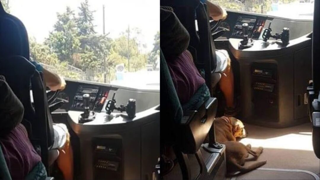 Στη φωτογραφία βλέπουμε τον οδηγό λεωφορείου στη Σκιάθο, ο οποίος παίρνει μαζί του έναν αδέσποτο σκύλο που φροντίζει για να μην υποφέρει λόγω του καύσωνα.