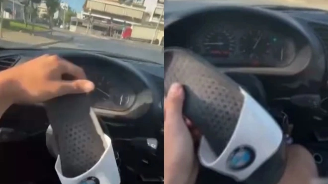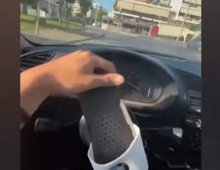 Σε δρόμο της Αργυρούπολης, με τις εικόνες μάλιστα να ανεβάζει στο διαδίκτυο, ο ίδιος ο οδηγός. Έχει αφαιρέσει τη στεφάνη του τιμονιού και έχει προσαρμόσει στη θέση της μία παντόφλα, με την οποία δίνει πορεία στο όχημα.