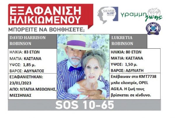 Ο 83χρονος David Harrison Robinson και η 80χρονη σύζυγός του, Lukretia Robinson έφυγαν από το σπίτι τους, στην περιοχή Ντάπια Μεθώνης του δήμου Πύλου Νέστορος στην Μεσσηνία, με το αυτοκίνητό τους μάρκας OPEL AGILA DIESEL 1300, μοντέλο 2009, χρώματος μπλε ελεκτρίκ, με αριθμό κυκλοφορίας ΚΜΤ7738. Πιθανός προορισμός τους ήταν η Μονεμβασιά.