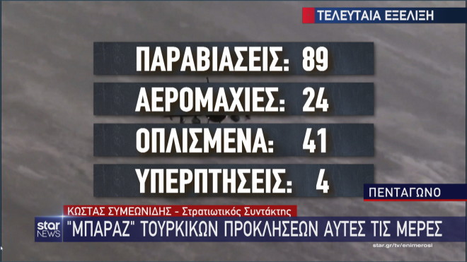 Τα νούμερα «μιλούν» από μόνα τους. Μέχρι και χθες είχαν γίνει 89 παραβιάσεις, 24 αερομαχίες, 41 τουρκικά μαχητικά ήταν οπλισμένα, ενώ υπήρξαν και 4 υπερπτήσεις πάνω από ελληνικά νησιά.