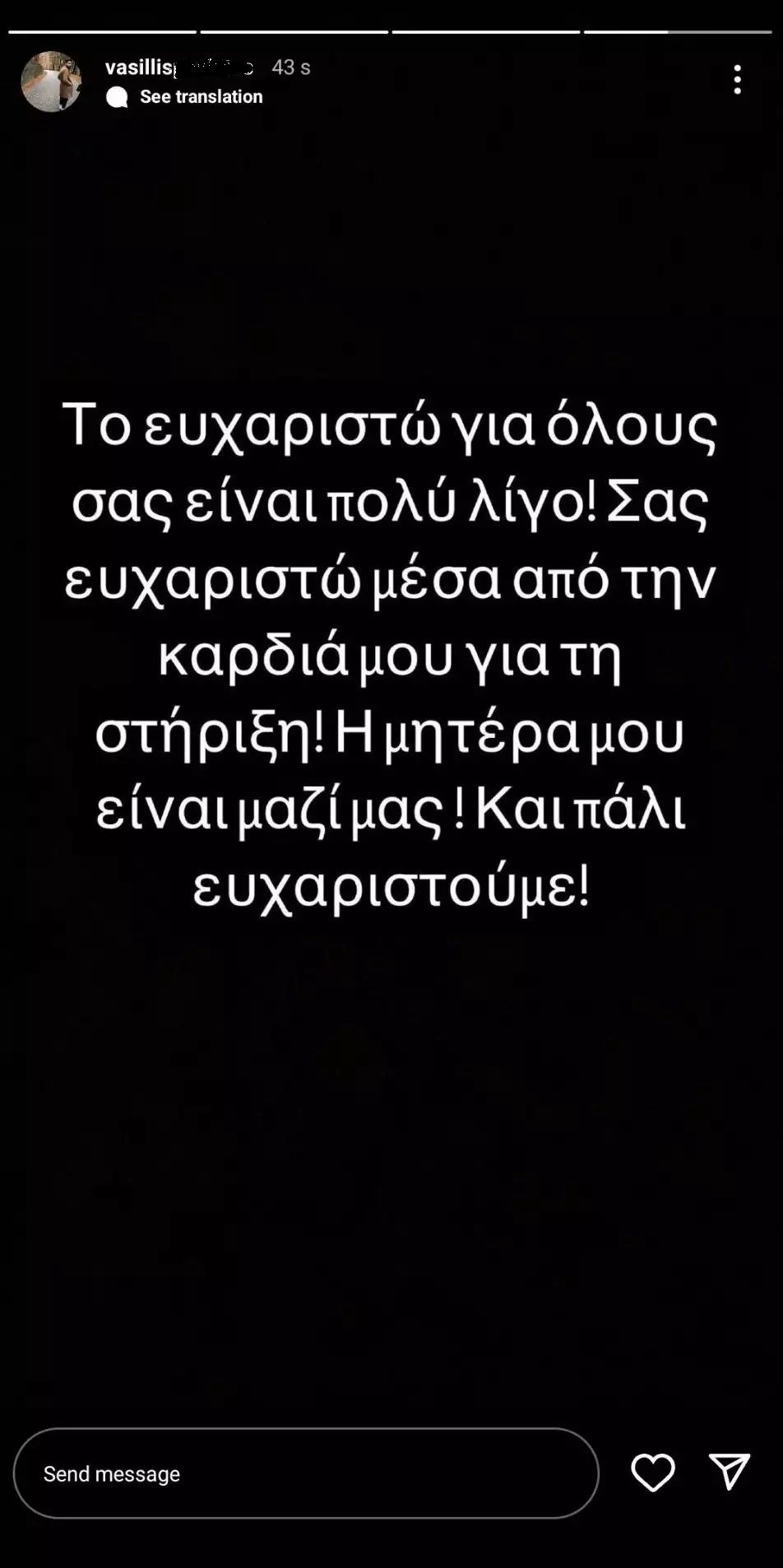 Ο γιος της, Βασίλης , ανέβασε ευχαριστήριο μήνυμα σε story στον λογαριασμό του στο Instagram, στο οποίο έγραψε: