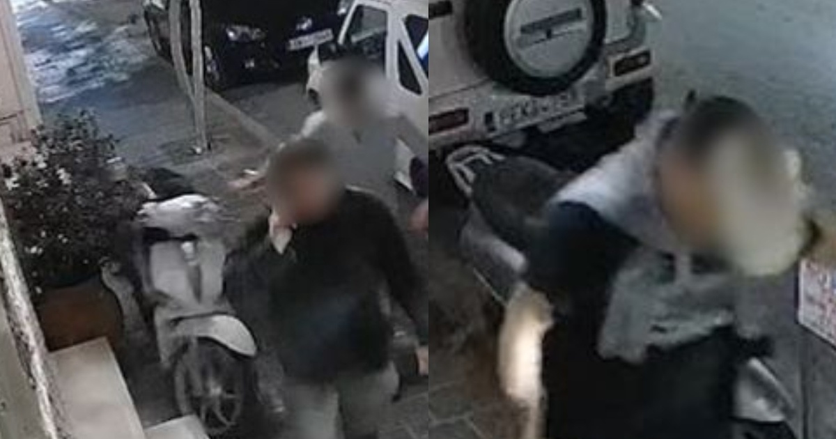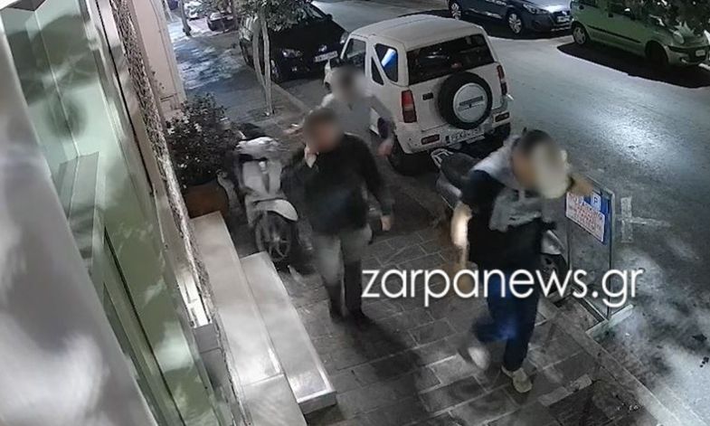 Καταγράφηκε από κάμερα ασφαλείας στην οδό Μίνωος στα Χανιά, περαστικοί να ρίχνουν ένα σταθμευμένο μηχανάκι στο έδαφος, το βράδυ της περασμένης Κυριακής.