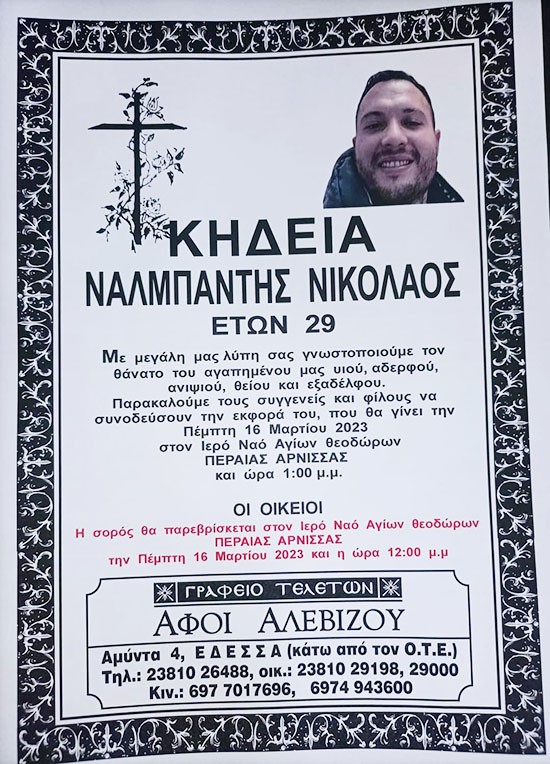 Τελέστηκε η κηδεία του Νίκου Ναλμπάντη, σήμερα, στην Περαία του Δήμου Έδεσσας, παρουσία συγγενών και φίλων, αλλά και του πατέρα του.