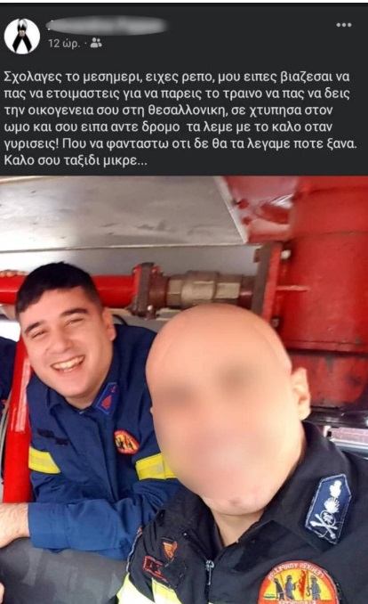 «Είχε ρεπό, μου είπες βιάζεσαι να πας να ετοιμαστείς για να πάρεις το τρένο να πας να δεις την οικογένειά σου στη Θεσσαλονίκη, σε χτύπησα στον ώμο και σου είπα άντε δρόμο τα λέμε με το καλό όταν γυρίσεις! Πού να φανταστώ ότι δεν θα τα λέγαμε ποτέ ξανά. Καλό σου ταξίδι μικρέ…» έγραψε ένας από τους συναδέλφους του 23χρονου.